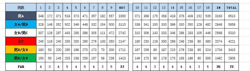 3.混合团体成绩取该队ABC组最好的3名运动员2轮(36洞)成绩之和。
