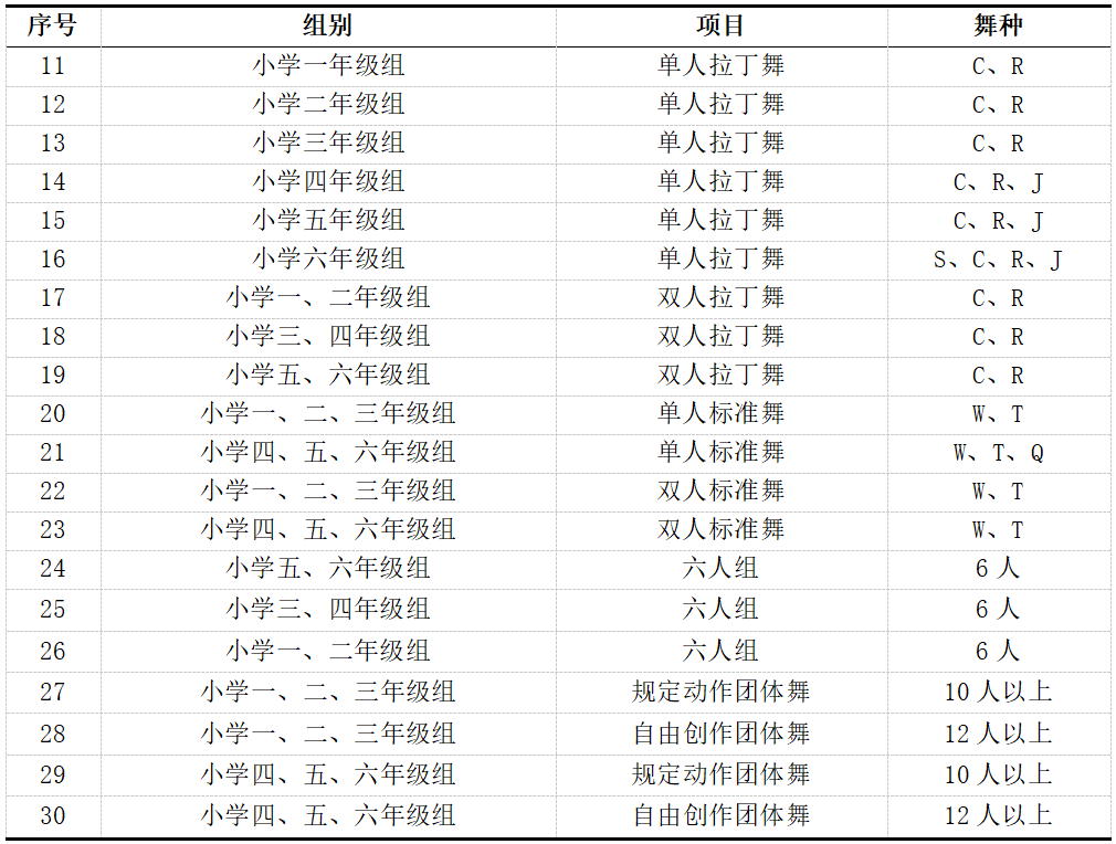 设中学(双人、单人、六人、团体舞)组、小学(双人、单人、六人、团体舞)组等30个(拉丁舞、标准舞)组别项目(详见附件:组别设项)