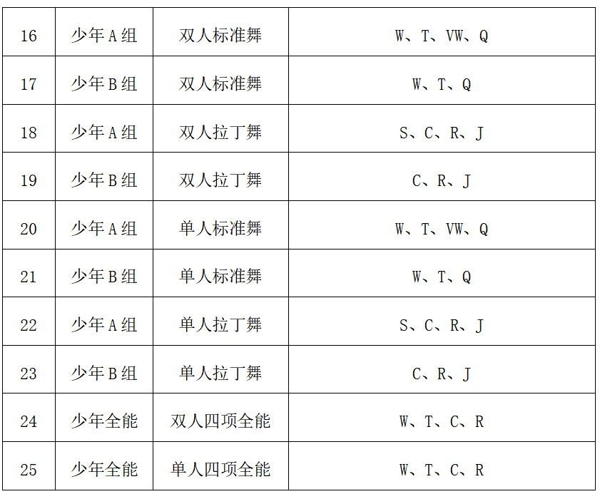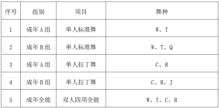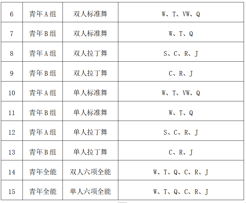 (五)标准舞A组比赛曲目顺序为华尔兹、探戈; 标准舞B组比赛曲目顺序为华尔兹、探戈、快步; 拉丁舞A组比赛曲目顺序为恰恰恰、伦巴; 拉丁舞B组比赛曲目顺序为恰恰恰、伦巴、牛仔; 四项全能组比赛顺序为华尔兹、探戈、恰恰恰、伦巴;六项全能组比赛顺序为华尔兹、探戈、快步、恰恰恰、伦巴、牛仔。