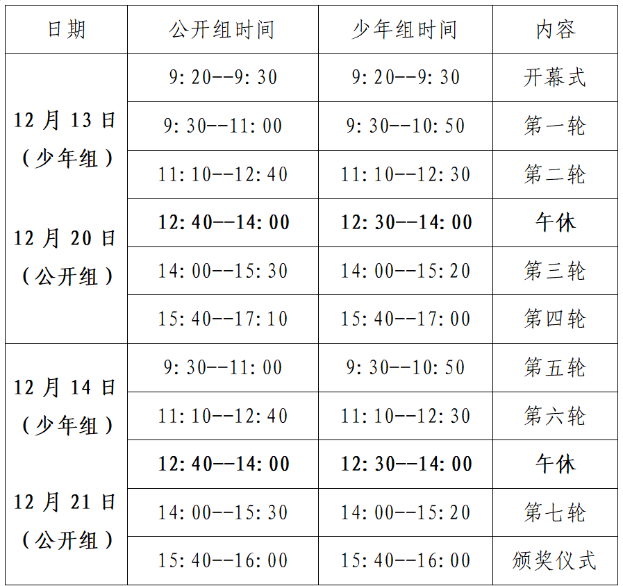 少年组于2025年12月13-14日、公开组于12月20-21日在柳州市文惠路60号柳侯公园·春园举行。