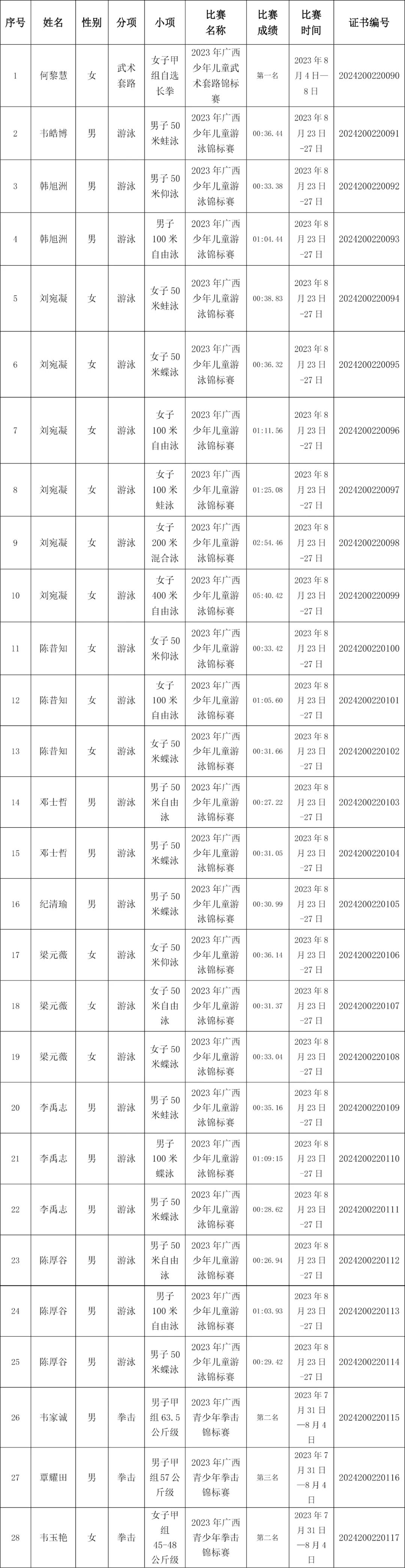 柳州市第十五中学滨江校区:韩旭洲(男子50米仰泳、100米自由泳)、刘宛凝(女子50米蛙泳、50米蝶泳、100米自由泳、100米蛙泳、200米混合泳、400米自由泳)