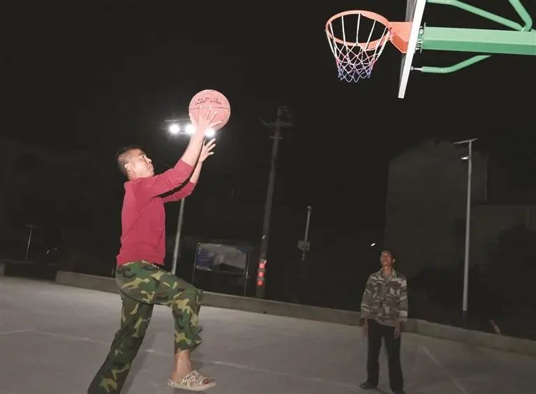 在鹿寨县黄冕镇盘龙村白花寨屯,村民在灯光球场上打球锻炼。