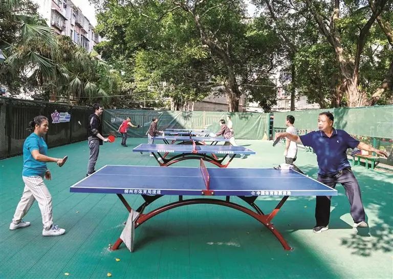 在柳南区车辆厂东社区的健身活动点,市民在改造后的乒乓球场内打球。