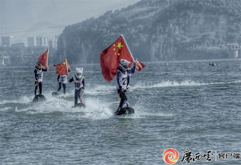 图为柳州市第十六届运动会动力冲浪板项目竞技现场,青少年选手手举国旗,正逐浪穿行于柳江。唐绍怡 摄