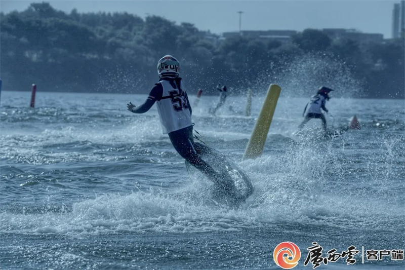 图为柳州市第十六届运动会动力冲浪板项目竞技现场,青少年选手正逐浪穿行于柳江。唐绍怡 摄