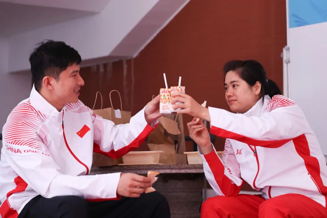 黄梦萍(右)和罗振邦在吃午餐时“干杯”庆祝夺冠。