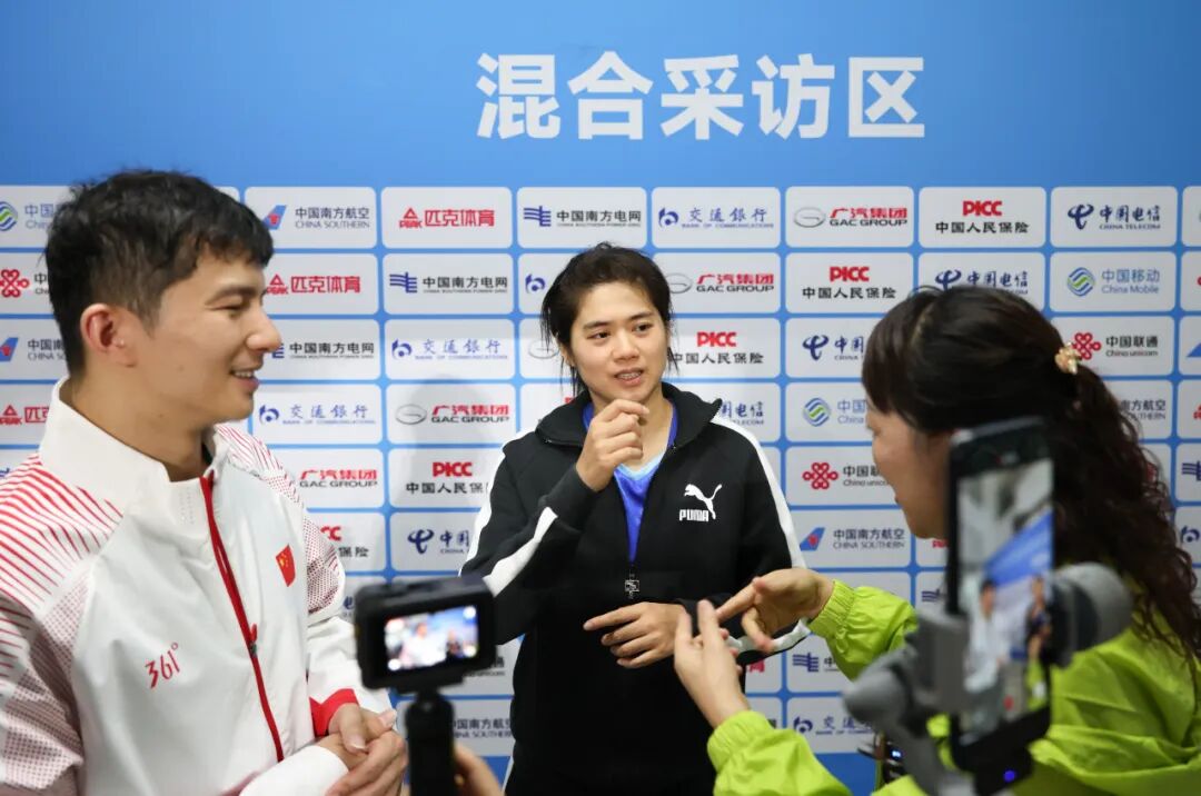 黄梦萍(左)在比赛中通过手语和罗振邦交流。