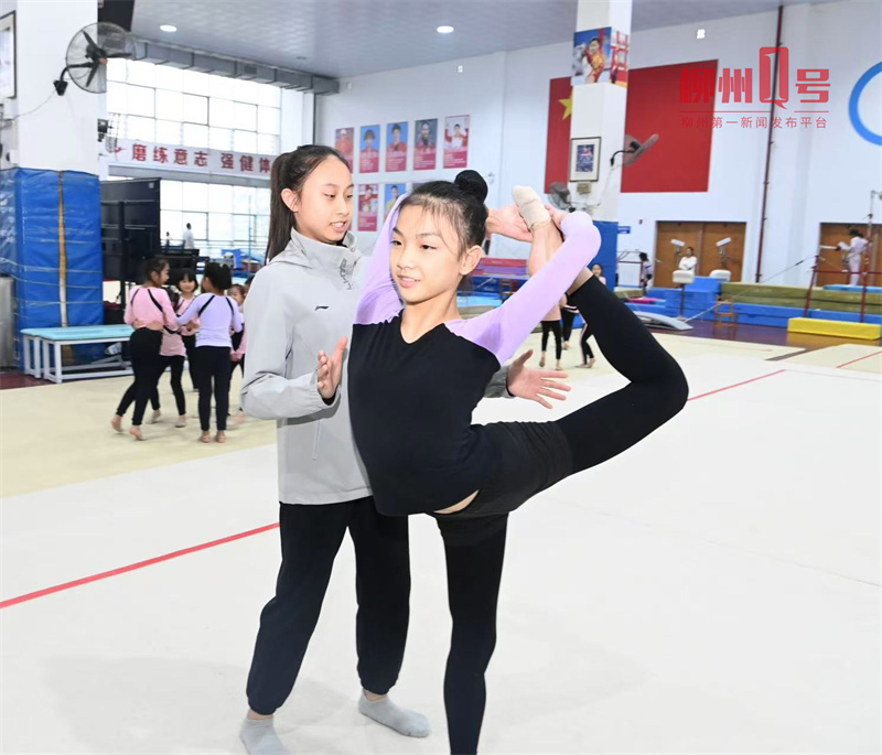 一旁的艺术体操训练场,6位在广西队训练的艺体小花接过教练的指挥棒,带着小运动员练起来。这6位艺体小花在今年的国内赛场均有不错表现,叶乔黄韦是6位艺体小花中唯一参加了第十五届全国运动会的队员,她一边纠正小运动员的技术动作,一边鼓励她们。“明年的区运会是她们的舞台,希望她们能绽放出自己的光彩,取得好成绩。”