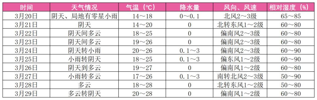 备赛和比赛期间气象条件总体适宜,早晚寒凉需注意保暖。根据最新气象资料分析,预计3月20-29日柳州市区天气相对平稳,无明显强降雨、强对流天气过程,其中3月24-25日、27日有小雨;天气回暖明显,昼夜温差较大。具体天气要素预报如下: