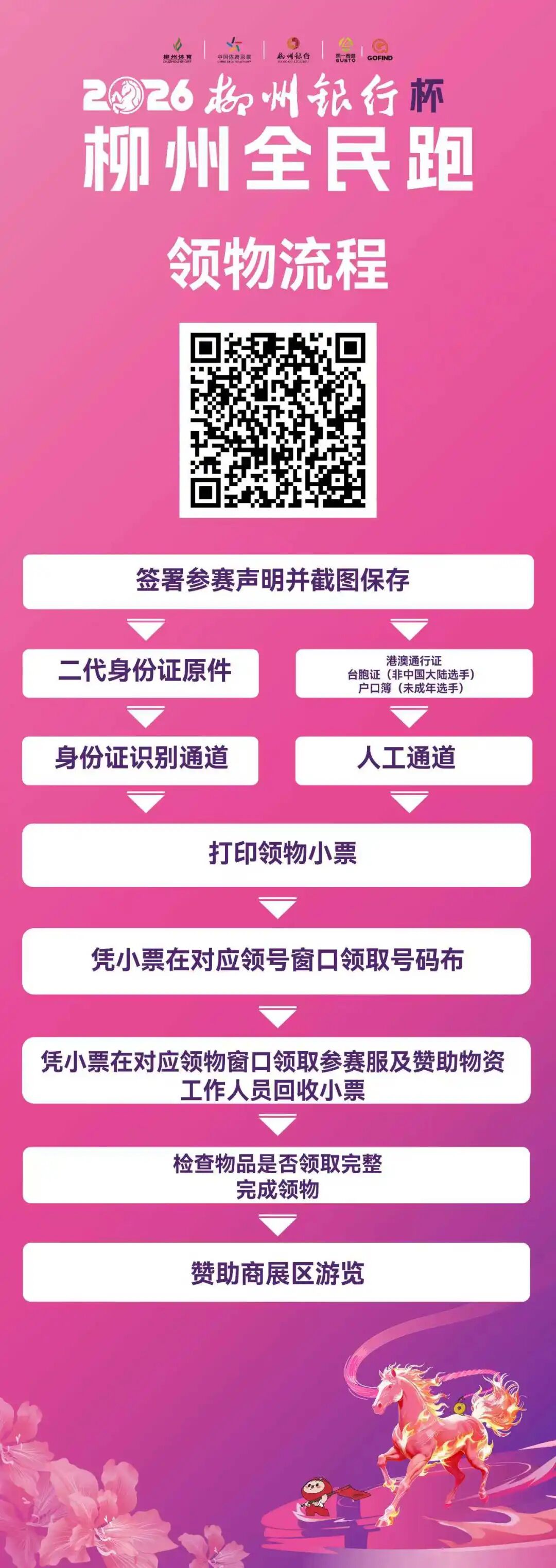 请参赛选手在领物当天,先扫码签署参赛声明。18周岁以下或65周岁(含)以上参赛者的监护人签名;(电子版或纸质版)