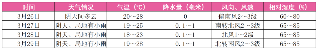 备赛和比赛期间气象条件总体适宜,早晚寒凉需注意保暖。根据最新气象资料分析,预计3月26-29日柳州市区持续阴雨天气,天气相对平稳,无强降雨、强对流天气过程;气温呈波动性式上升趋势。具体天气要素预报如下: