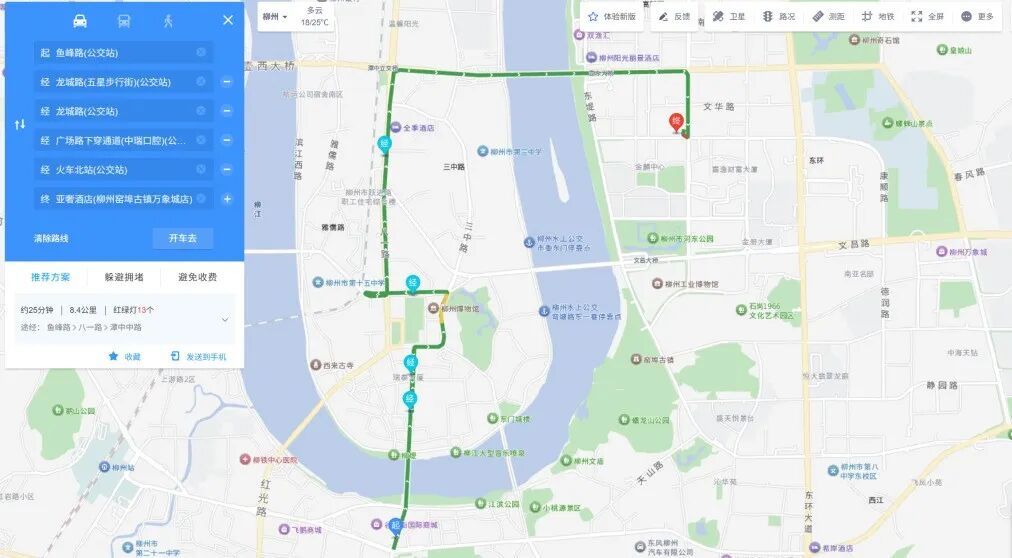 银泰城(鱼峰路公交站)→龙城路(五星步行街)公交站→龙城路公交站→广场路下穿通道(中瑞口腔)公交站→火车北站公交站→接驳车下车点(亚奢酒店)