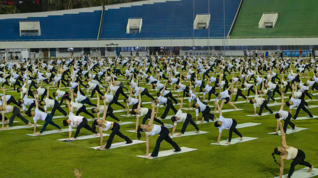 紫荆花海下千人齐练瑜伽,场面壮观,零基础也能轻松加入。