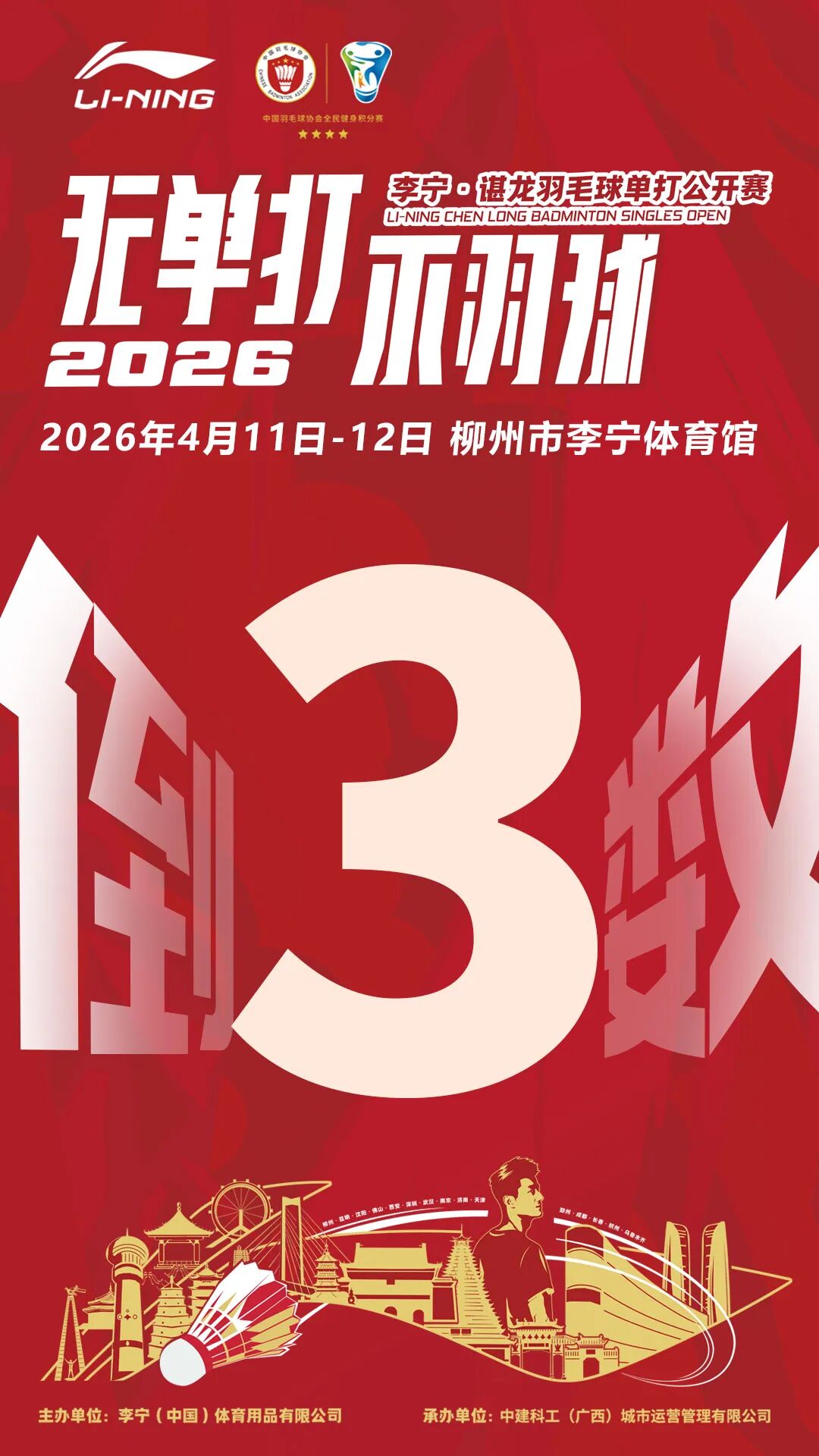 【赛事活动】2026年李宁·谌龙羽毛球单打公开赛柳州分站赛倒计时3天!