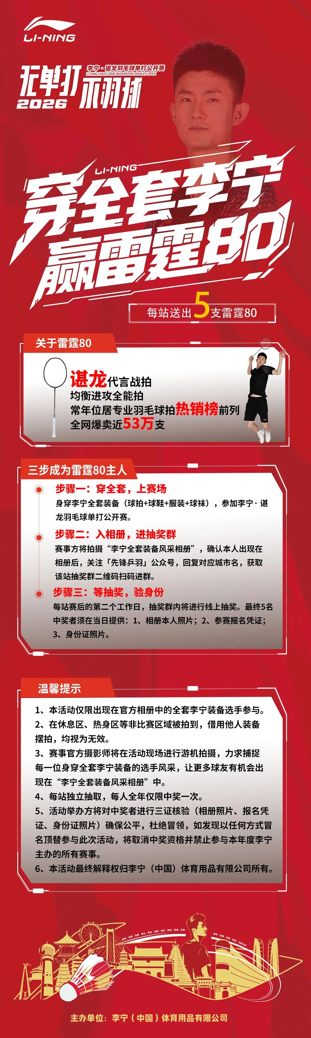 参加2026李宁·谌龙羽毛球单打公开赛柳州分站赛的选手们注意了!除了在赛场上挥洒汗水、角逐荣誉,本届赛事还为大家准备了一份重磅福利——“穿全套李宁,赢雷霆80” 特别活动。