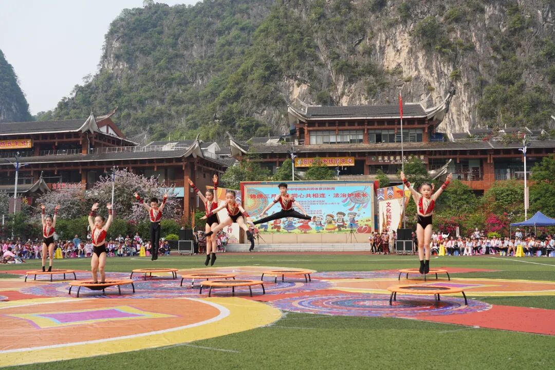 表演中,技巧队的小队员们精神抖擞、身姿灵动,在教练们的精心编排与专业指导下,小蹦床跳跃轻盈舒展、技巧组合动作精准流畅,每一个高难度动作都完成得干净利落、精彩纷呈,充分展现了扎实的专业功底和昂扬向上的体育精神。精彩绝伦的表演赢得了现场师生的阵阵欢呼与掌声,深受孩子们的热烈喜爱,不仅让苗乡学子近距离感受到竞技体育的独特魅力,更在孩子们心中种下了热爱体育、参与竞技体育的种子,有效点燃了大家投身体育锻炼、追逐体育梦想的热情。