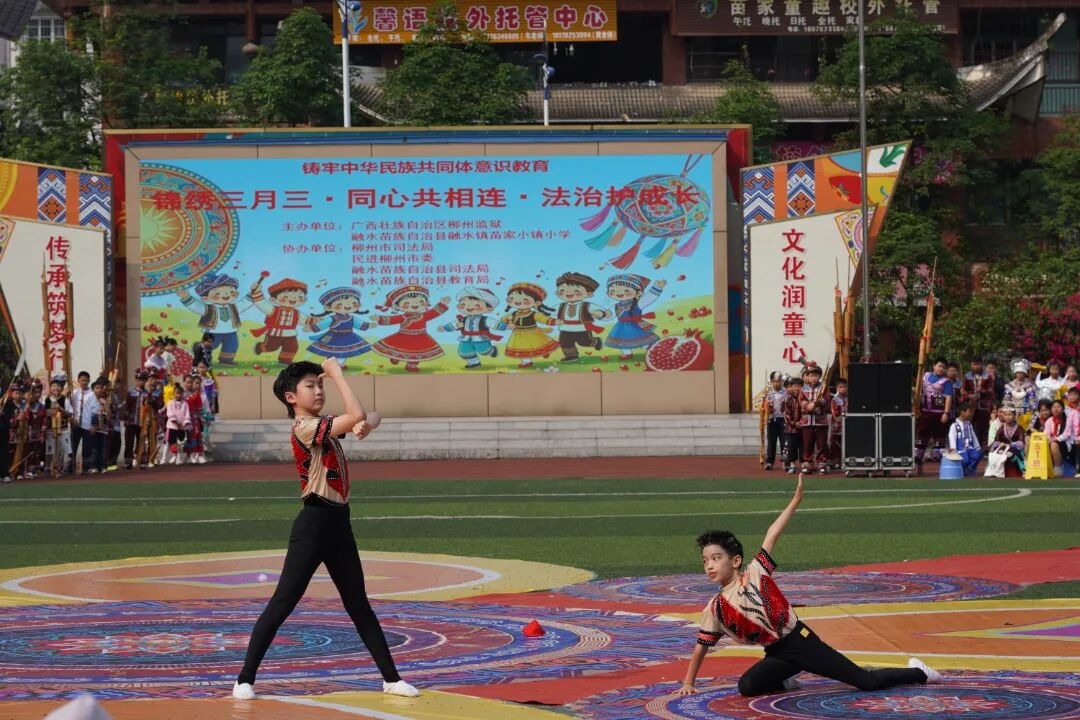 在壮族传统佳节“三月三”到来之际,4月13日下午,“锦绣三月三·同心共相连·法治互成长”文化下乡暨法治进校园活动,在融水县融水镇苗家小镇小学温情举行。民进柳州市委主委、市社科联主席关勇军及民进爱心会员代表、机关专干等参加活动,柳州市体育运动学校技巧队受邀倾情参演,以精彩的体育表演为苗乡学子送上别样的节日祝福,助力体育下乡、体教融合工作走深走实。