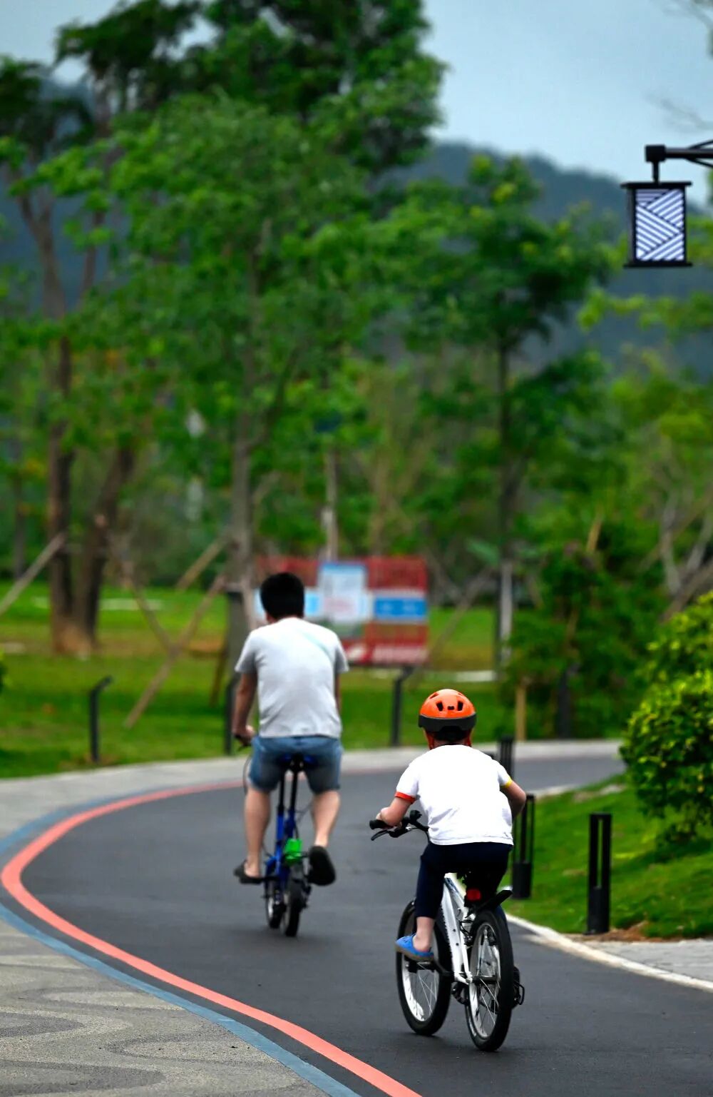 2021年5月3日,游人在柳州市柳东新区滨江生态公园里骑行。新华社发(黎寒池 摄)