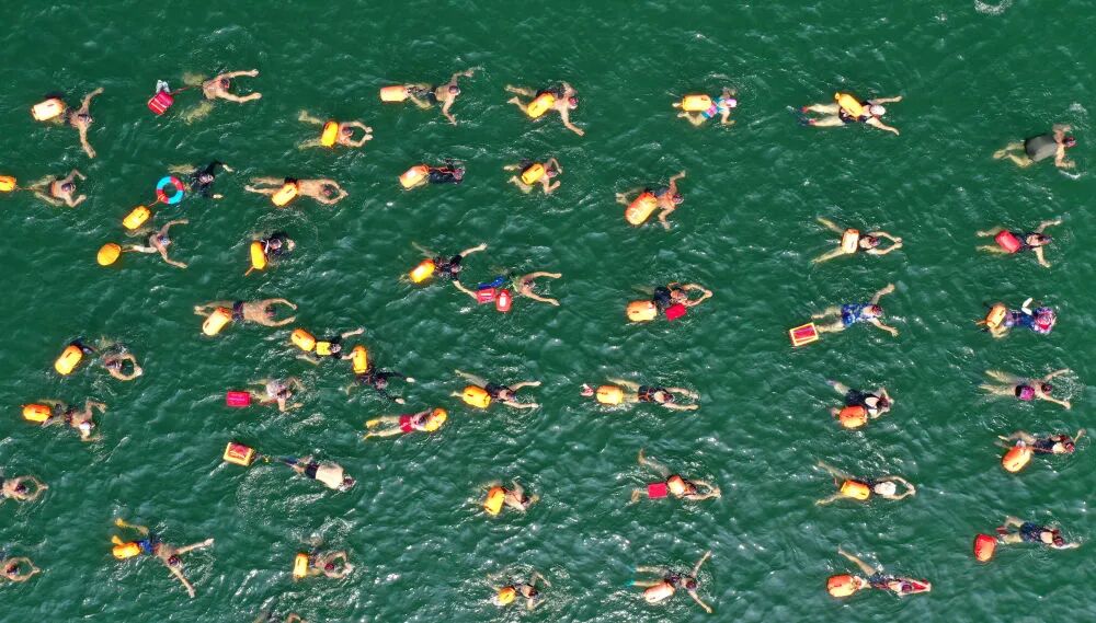 2021年10月2日,游泳爱好者畅游广西柳州柳江(无人机照片)。新华社记者 黄孝邦 摄