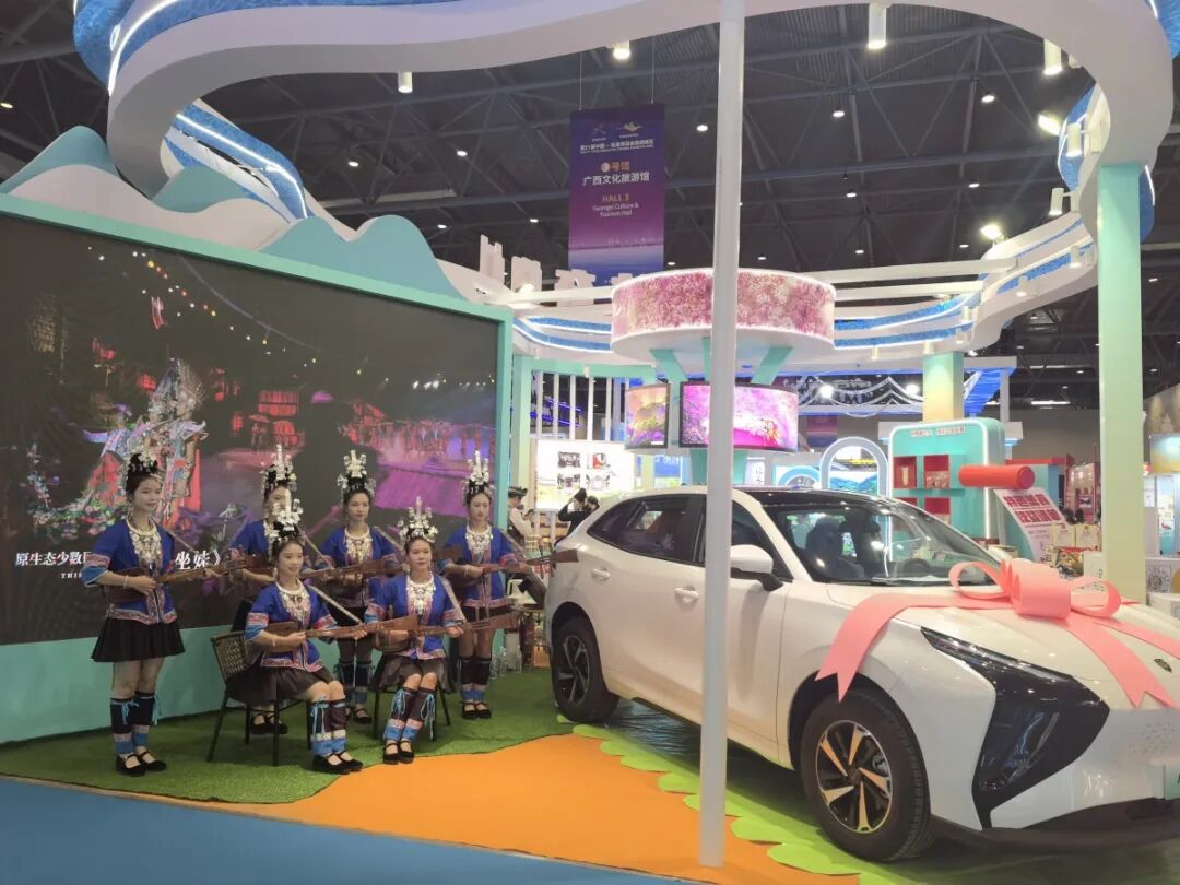 该展位特别展示了柳州彩调剧“刘三姐”作为广西舞台艺术经典荣登国家殿堂演出的故事,展出今年“打卡惊奇柳州”活动同款大奖——东风风行雷霆410汽车,吸引不少游客驻足观看。