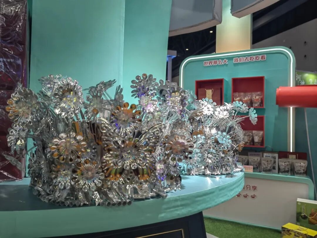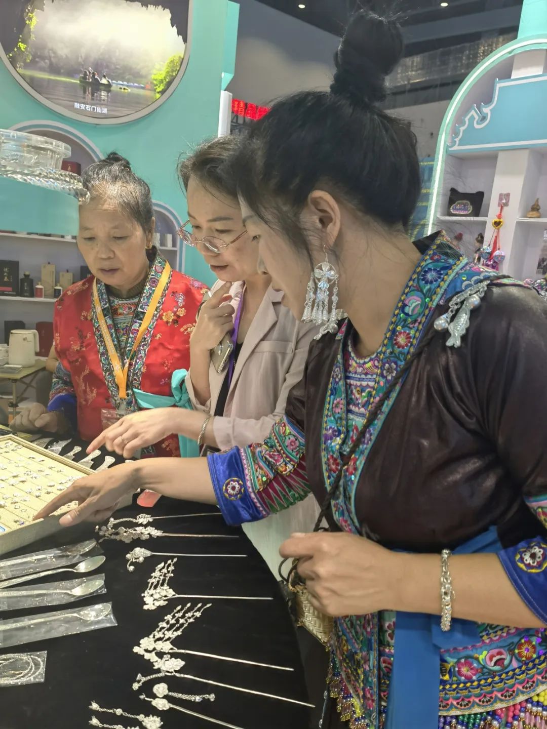 活动现场,柳州袋装螺蛳粉、少数民族银饰品、扎染手工艺品、浸泡酒、牛腊巴等丰富的文创产品、旅游商品,吸引不少观展者进入柳州展馆“打卡”。