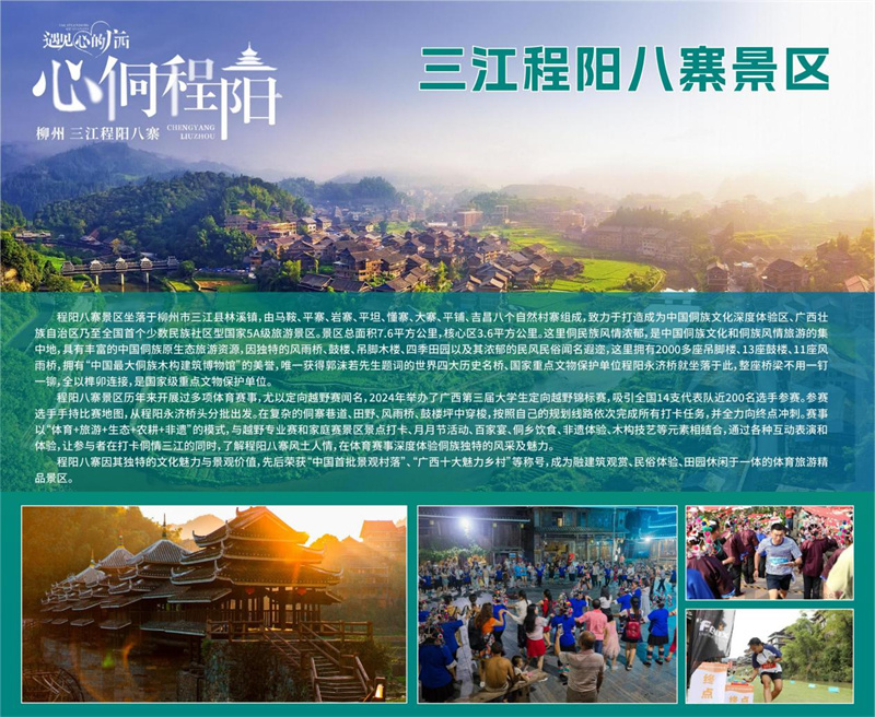 近年来,程阳八寨景区积极探索“体育+旅游+非遗+农耕”的融合发展模式,将侗族大歌、多耶、芦笙踩堂、百家宴等传统文化项目、现代户外运动与旅游体验有机结合。景区曾作为 “跟着赛事游广西”、“体育赛事进景区”文体旅活动的主场之一,开展了广西大学生定向越野锦标赛、“大吉大利 玩转广西”和平精英广西村镇赛总决赛等赛事活动。2024年9月更是吸引了奥运游泳冠军张雨霏前来体验侗乡多彩风情。