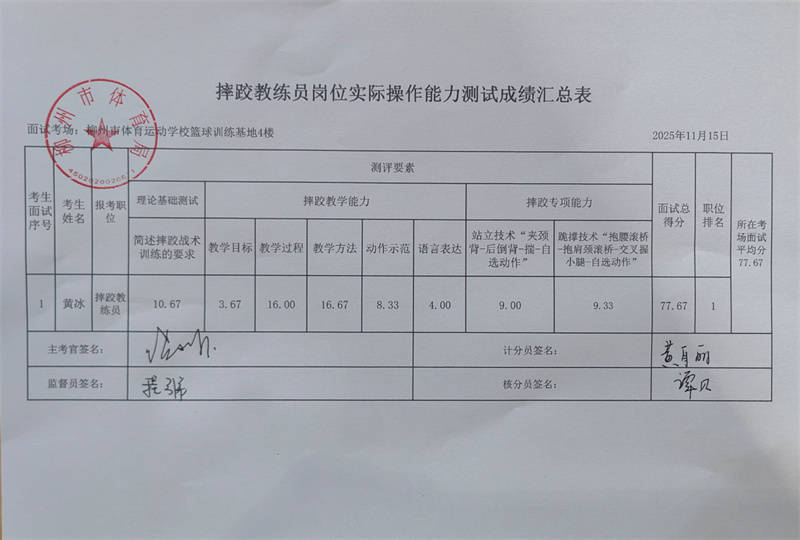 2025年度柳州市体育局下属事业单位柳州市体育运动学校公开招聘中高级(急需紧缺)人才(第四批)面试成绩公告