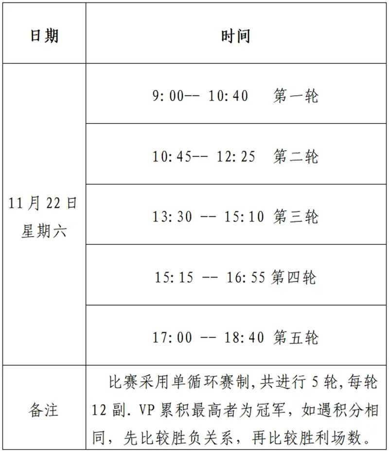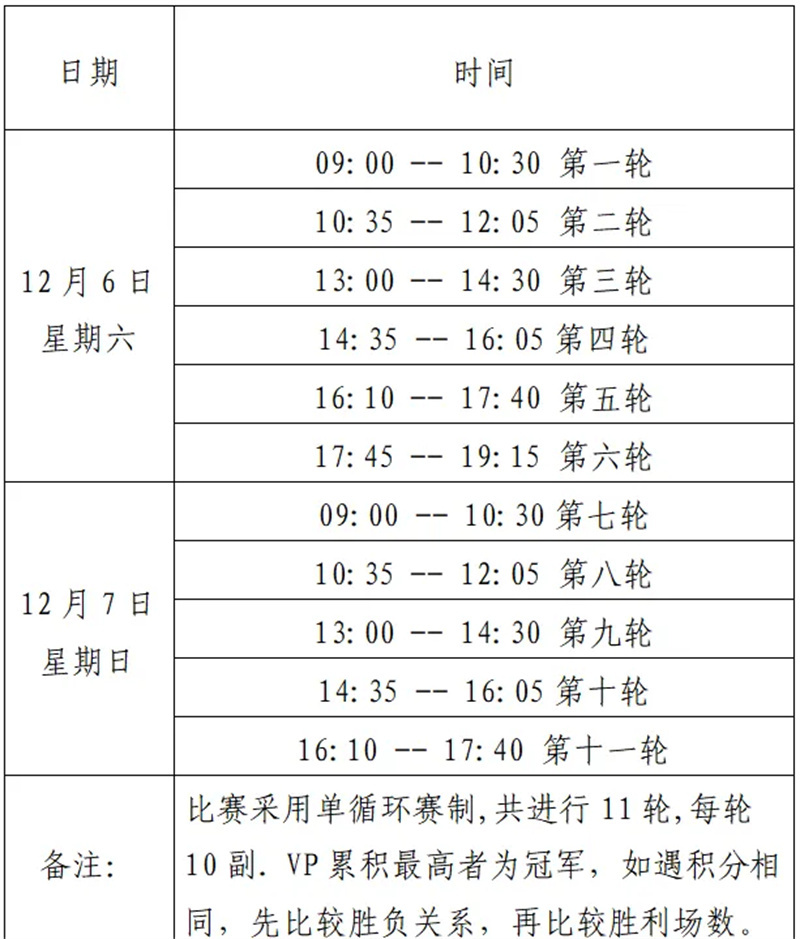 (二)比赛采用单循环赛制, 精英组共进行5轮,每轮12副. 公开组共进行11轮,每轮10副.VP累积最高者为冠军,如遇积分相同,先比较胜负关系,再比较胜利场数。